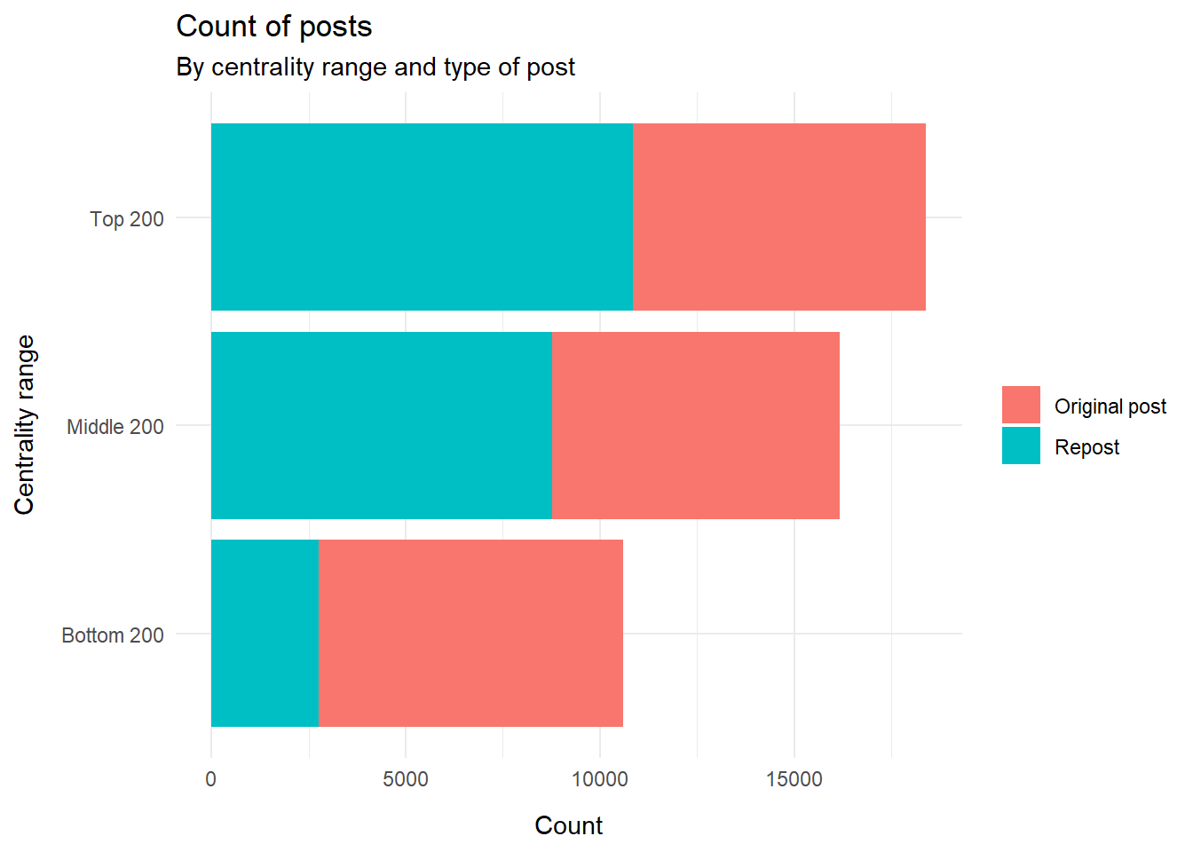 It appears that the top-centrality-members account for a disproportionately large chunk of the posts, because this segment has many reposts. That is perhaps not surprising; they have many connections and are therefore probably exposed to more material fit for resposting.