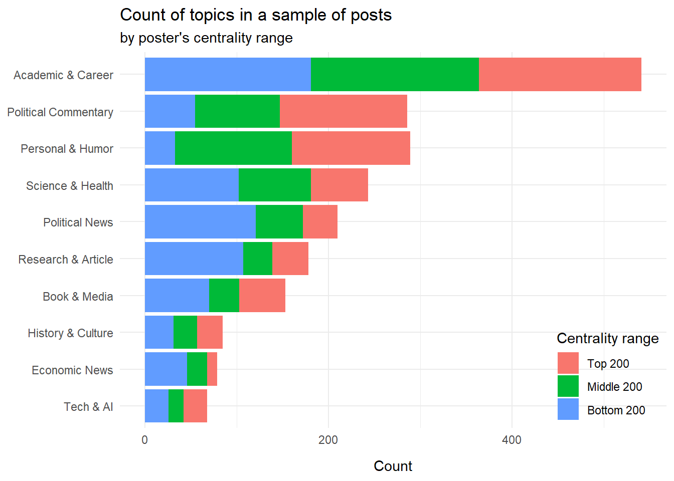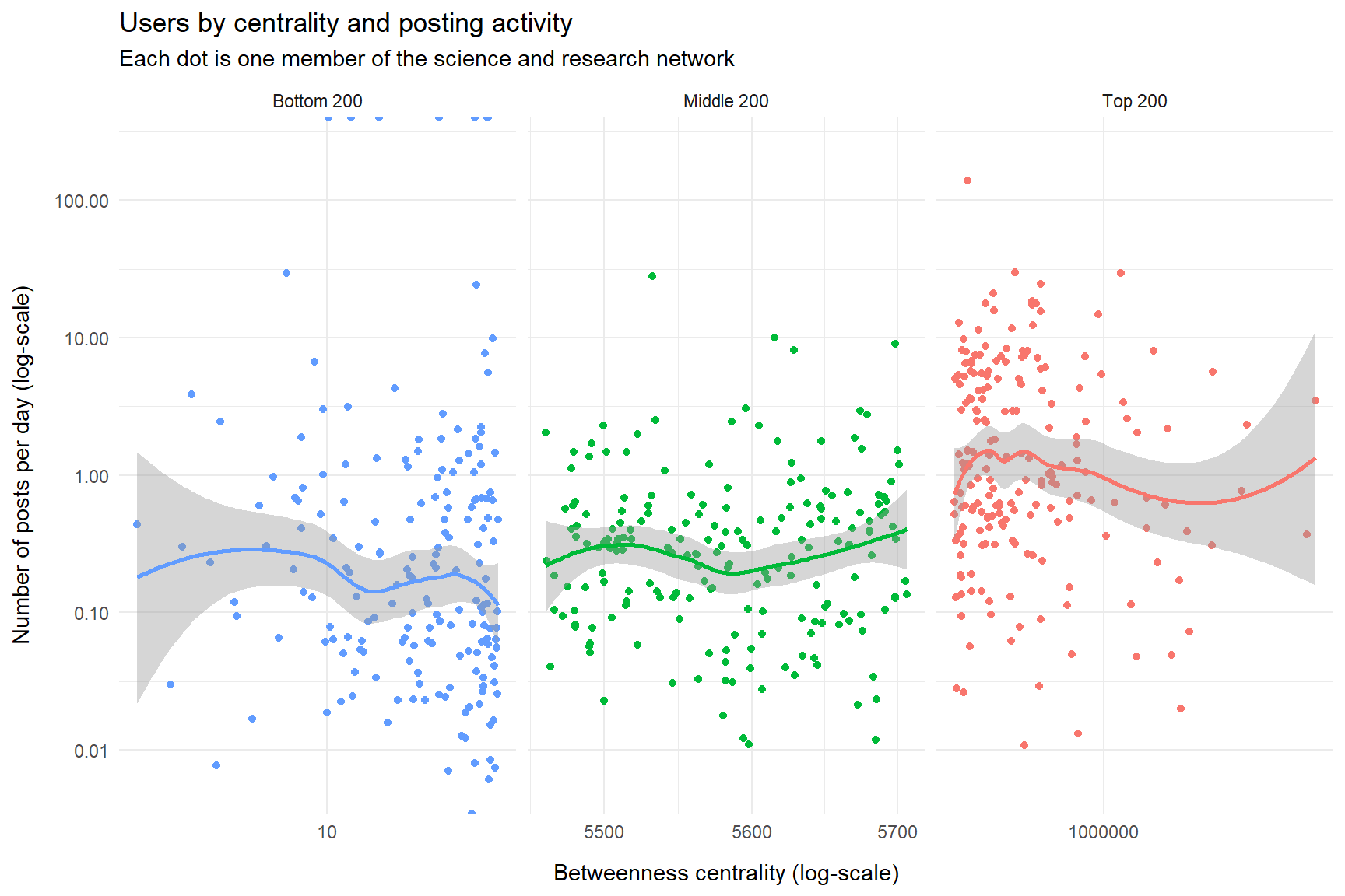 Collected fresh data with posts, this time not only from the top-200 members, but also from the middle-200 and bottom-200 members, as measured by the ‘betweenness centrality’ metric (explained here).
