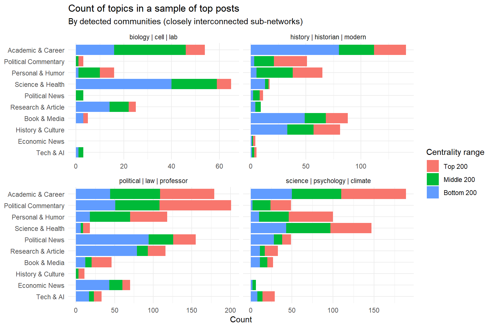 So to some extent the suspicion is confirmed: The most influential network members do have different preferences for topics they post about, leaning more towards politics than traditional science-related topics.